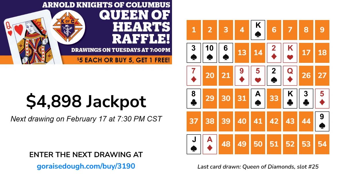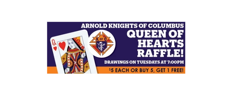 The Arnold Club dba Arnold K of C, a 501(c)(3) Non-Profit Organization in Arnold, Missouri is selling $5 online tickets in our progressive 50/50 Queen of Hearts E-Raffle.
